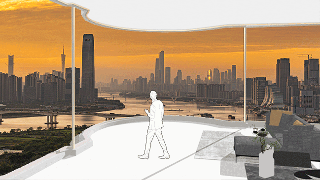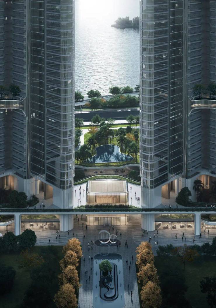 保利鱼珠岛采用“雁字形”建筑设计,外立面为全玻璃幕墙,线条流畅圆润,极具视觉冲击力。这种设计不仅实现了全南全江的景观视野,还通过圆弧形转角设计,打破了传统建筑的局限性,真正做到了沉浸式观江。