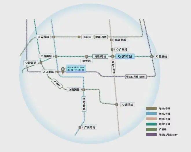 从项目出发,步行约800米即可抵达地铁2号线江泰路站,未来11号线开通后将成为换乘节点,出行选择更多元。除了地铁,周边还有广佛线燕岗站、8号线昌岗站,三条线路交织成网。开车的话,江南大道、工业大道、广州大道、内环路和环城高速五大主干道环绕,早高峰经内环到珠江新城约25分钟,去琶洲会展片区也不到30分钟。这种“轨道+路网”双支撑的交通结构,在海珠南片区并不多见,尤其适合在琶洲、天河北或越秀上班的人群。
