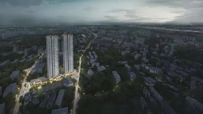 49层双塔布局,外立面以浅灰铝板与玻璃幕墙勾勒现代轮廓