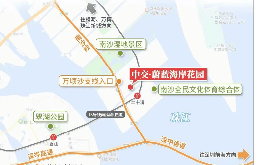 交通是项目最大亮点之一。距在建的18号线南延线(南中城际)二十涌站约500米,该线路设计时速160公里,西线2027年通中山,东线2030年抵珠海拱北;另规划深南中城际亦设站于此,未来将实现广深中珠四城30分钟互联。自驾方面,距深中通道南沙线收费站仅约1公里,25分钟直达深圳宝安机场,30分钟通达前海。即便前往广州市中心,经18号线快车约40分钟可达冼村。项目虽地处南沙最南端,却因多条高速轨交交汇,成为真正意义上的“大湾区十字枢纽”。