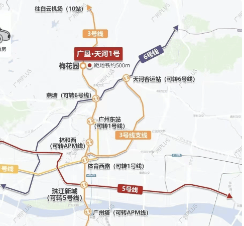 项目位于广州市天河区怡新路。根据高德/百度地图实测,从项目西侧主出入口步行至地铁3号线梅花园站B出口的直线距离约为400米,实际步行距离约450-500米,正常步行时间在5-7分钟以内,属于标准的“地铁口物业”范畴,通勤极为便利。