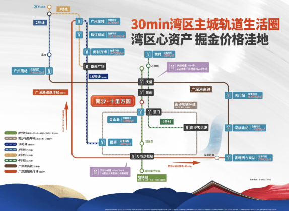 南沙十里方圆三期所处的位置,堪称湾区交通的“黄金十字路口”。项目距离地铁4号线黄阁站约2.6公里,虽非零距离地铁口,但通过便捷的公交接驳系统,轻松实现无缝换乘。搭乘4号线,1站即达南沙区政府所在地,2站便可抵达庆盛枢纽——这里不仅是广深港高铁的重要站点,更是未来多条国家高铁干线的交汇点。