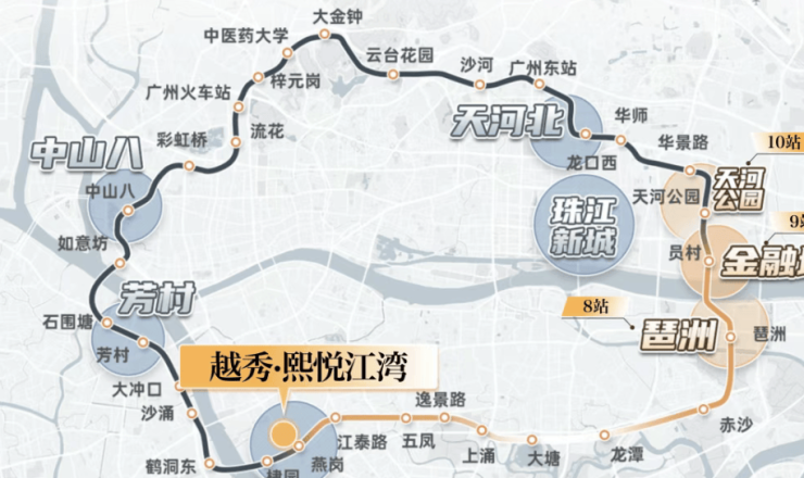 在现代都市生活中,时间是最宝贵的财富,而交通的便捷度直接决定了时间的利用效率与生活半径的广度,【越秀·熙悦江湾】凭借其得天独厚的地理位置与完善的路网结构,构建了“双地铁 + 自驾 + 公交”的立体交通体系,实现了数据化的全城通达,让出行变得高效而从容,真正做到了“出则繁华”。首先,在轨道交通方面,项目最大的亮点在于其“双地铁上盖”的超强配置。距广州首条黄金环城线11号线棣园站约250m(百度地图直线距离),“换乘之王”广佛线燕岗站约400m(百度地图直线距离),0换乘直达珠金琶,轻松链接全城,虹吸广佛优质资源。根据广州地铁官方运营数据及规划,从项目乘坐地铁11号线可快速到达琶洲、珠江新城、白云新城等商务区,通勤效率极高;乘坐广佛线可快速直达佛山核心区,实现广佛一小时生活圈。特别是双地铁的叠加优势,将实现“一线直达天河,一线直达佛山”的极速通勤。