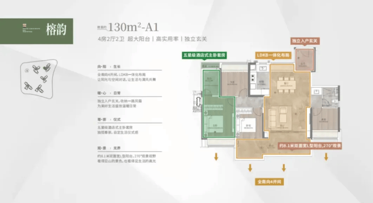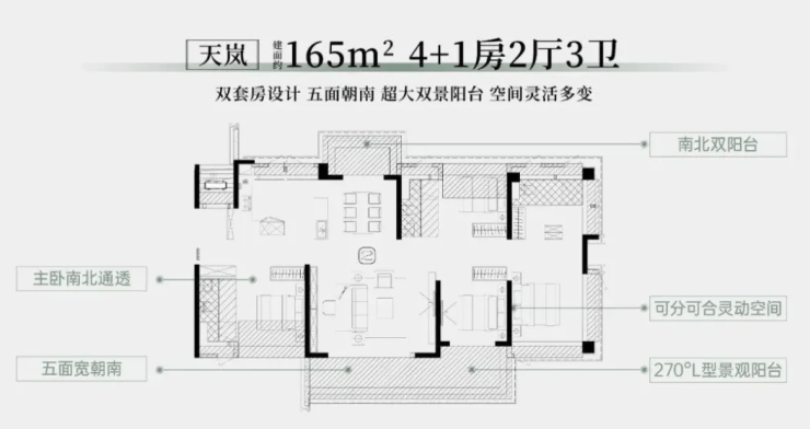 建面165㎡4+1房大平层针对高端改善人群,以极致的空间尺度与品质细节,重新定义天河改善人居标准。户型南向面宽达到17.4米,近9米L型景观阳台横跨客厅与卧室,站在阳台上即可俯瞰三山环绕的自然美景,将城市生态资源尽收眼底。双主套设计是该户型的一大亮点,主人房与长辈房均配备独立卫浴与衣帽间,让长辈与主人都能拥有独立私密的居住空间,充分尊重家庭成员的生活习惯。