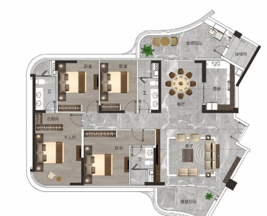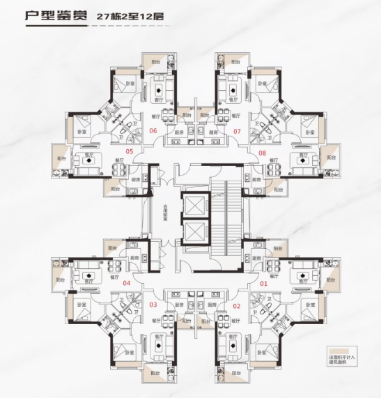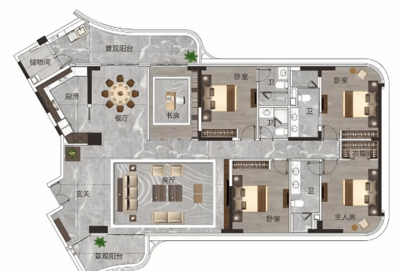 85-138㎡奢装洋房:高拓展面积户型,入户花园、阳台、飘窗等均有赠送空间,推窗即可饱览水岸景观。