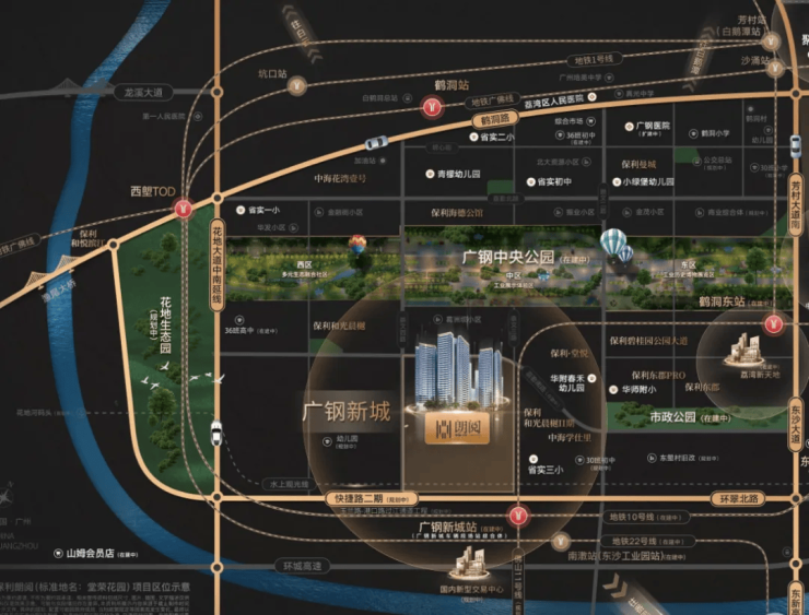 中海保利朗阅坐落于荔勤南路堂荣街24号,地处广钢新城创业西路黄金地段,北接白鹅潭CBD(车程约10分钟),南连广州南站(直线距离8公里),东望海珠创新湾(车程15分钟),形成“产业—居住—交通”三位一体的黄金闭环。作为广州中心区最后一块成片开发的高端居住板块,广钢新城自2025年最后一宗宅地出让后,未来三年无新增住宅用地供应。据广州市规划和自然资源局数据显示,当前片区可售新房不足2000套,按2025年月均去化速度测算,库存仅可支撑10个月,稀缺属性持续强化。