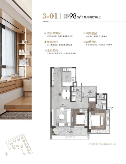 98㎡三房两厅两卫:总价约440–490万,三开间朝南,采光通风优异。配备可改造空中花园,灵活变身书房或儿童房;厨房采用玻璃隔断增强互动性,卫生间干湿分离,卧室带观景飘窗,实用率表现突出。