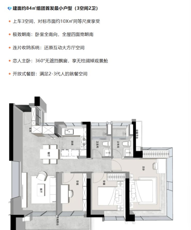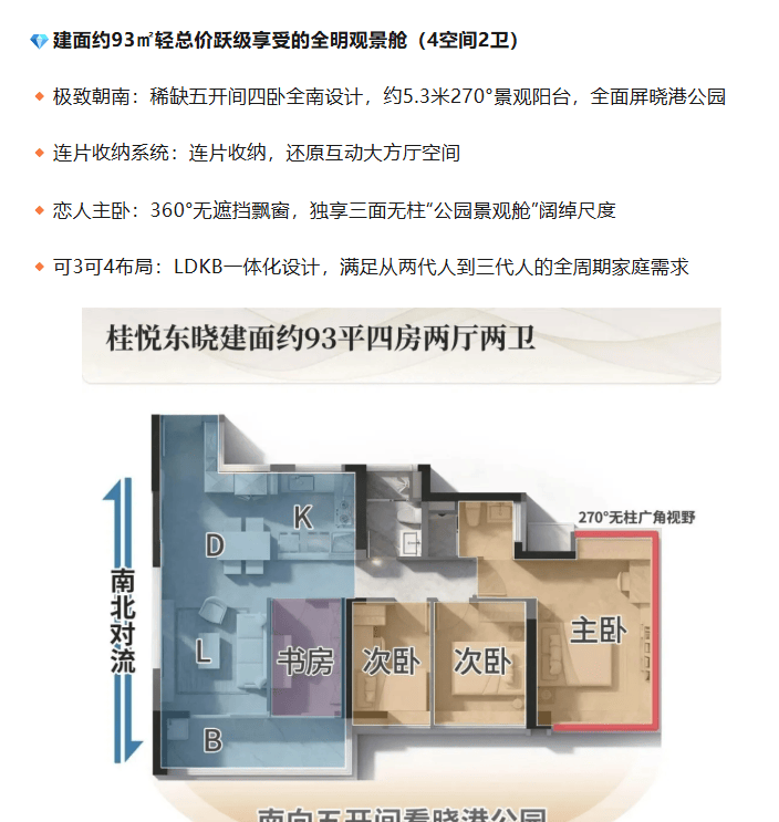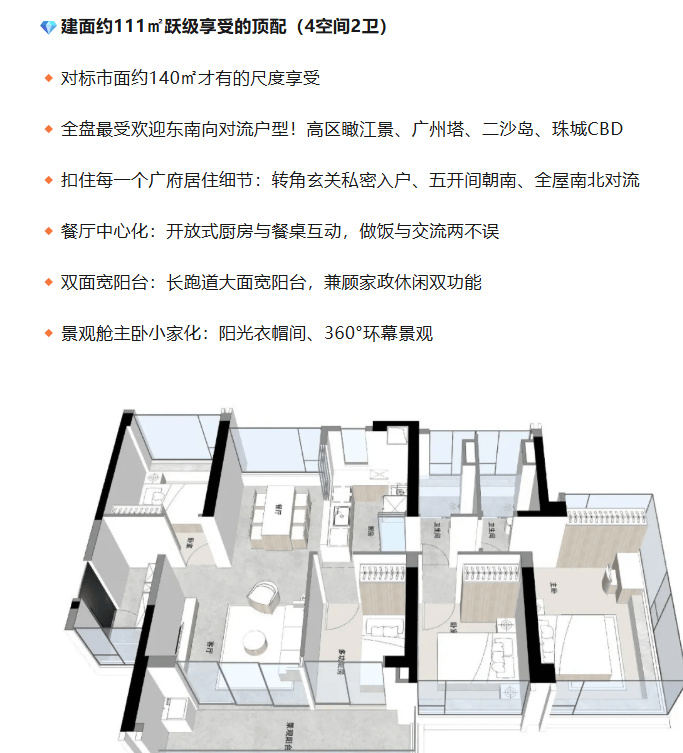 户型设计堪称一绝,建面约 84㎡的 3 空间 2 卫户型,卧室全南向,全屋四面宽朝南,还有连片收纳系统和 360° 无遮挡飘窗的恋人主卧。建面约 93㎡的 4 空间 2 卫户型,五开间四卧全南设计,约 5.3 米 270° 景观阳台,LDKB 一体化设计满足家庭全周期需求。建面约 111㎡的 4 空间 2 卫户型,东南向对流,高区能瞰江景、广州塔等,还有转角玄关、双面宽阳台等贴心设计。建面约 121㎡的 4 空间 2 卫户型,更是奢享型,入户有收纳间,空间五开间朝南,景观舱主卧豪宅化。特别是建面约 89㎡南向四空间户型,极致朝南,连片收纳,全方位满足居住需求。每个户型都紧扣广府居住细节,实用性与舒适性兼备。