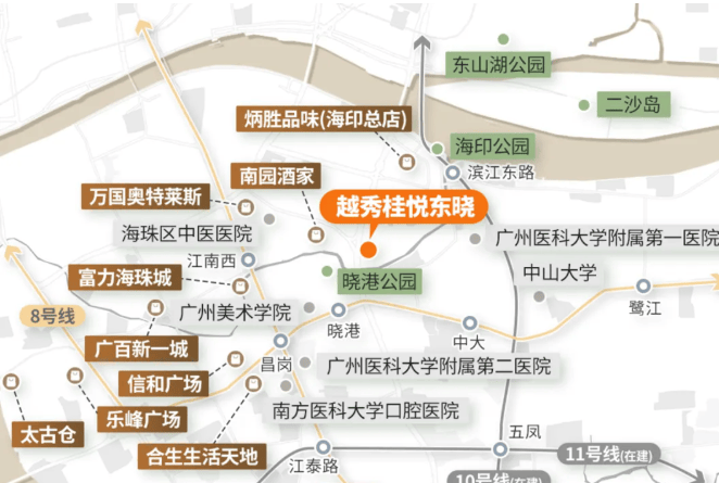 交通便利性是越秀・桂悦东晓的一大优势。五大主干道串联主城,离越秀、天河很近,约 8km 内,20 分钟左右就能通达珠城琶洲。三地铁交汇,8 号线晓港站步行约 8 分钟,还有 2 号线江南西站、10 号线滨江东站(在建中)。离海印桥南①公交站约 60 米,超 20 条公交线路能接驳各区。无论是选择地铁出行,还是公交、自驾,都能轻松畅达城市各处,日常通勤和出行游玩都非常方便。