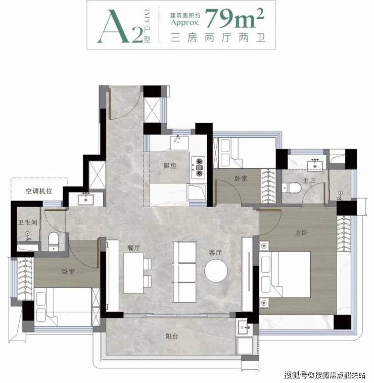 79㎡户型:实测使用面积80.98㎡,得房率125%,超越周边99㎡户型空间;