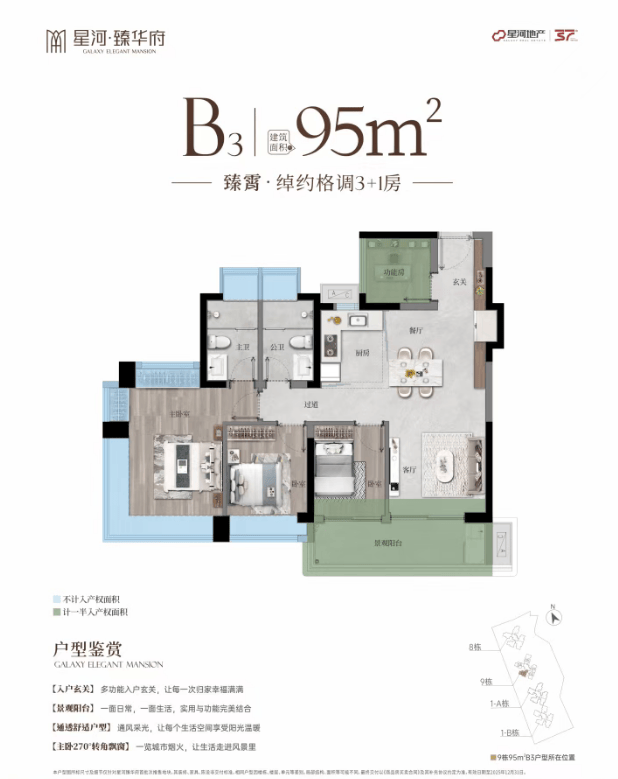 约95㎡3+1房:分布在1号楼、9号楼,入户飘窗玄关设计,主卧配备270°飘窗观景。