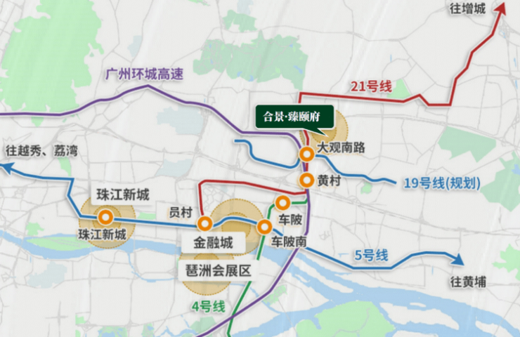 自驾出行十分便捷,可快速直达珠江新城、智慧城、金融城等中轴核心片区,通过白云机场、广州南站轻松实现跨城互联。公共交通方面,周边有地铁 21 号线智慧城站(约 1.5KM),作为全球第一座 AI 智慧车站,支持刷脸过闸和语音购票;地铁 4 号线黄村站(约 2KM)南北贯穿广州主城;规划中的地铁 19 号线大观南站预计 2025 年开通,未来出行将更加便利。此外,在建的广佛东环线、穗莞深城际轨道可直通白云机场、广州南站两大枢纽,进一步拓展出行半径。
