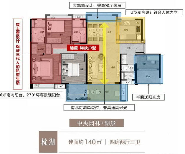 140㎡四房二厅二卫:四房双主套,6米大阳台,望湖极致景观面。