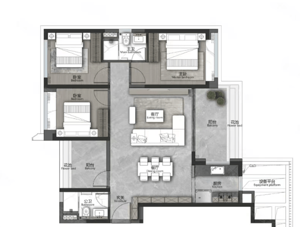 108㎡三房:得房率92%,最大约4.9米开间大方厅,主卧270°转角飘窗,全屋采光面达12米,西南朝向避开广州大道噪音。