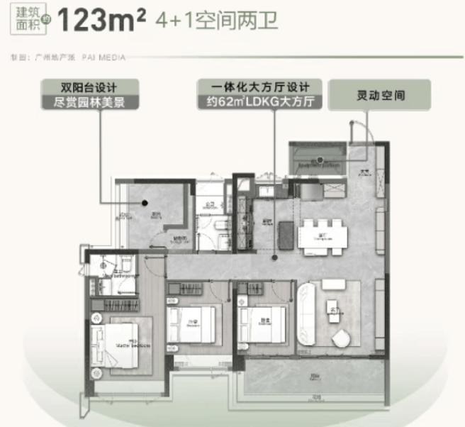 140㎡四房:得房率95%,电梯直达入户,约8.9米双联阳台,部分房源可北瞰广州塔,南向采光面达16米,南北对流设计,客厅开间超5米。