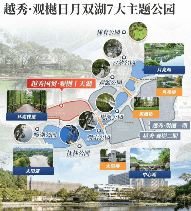 项目面对着占地约5.3万平方米的月亮湖和太阳湖,湖岸线长达约1.9公里。越秀对湖泊进行了大规模的整治与升级改造,使湖泊水质达到了二类饮用水标准。项目围绕双湖布局,建造了七大主题公园,其中六个已经实景呈现,还有一个规划中的体育公园预计明年开放。此外,项目还建成了广州首个临湖商业体,对标新加坡圣淘沙滨湖商业体,提供了丰富的生活便利设施。