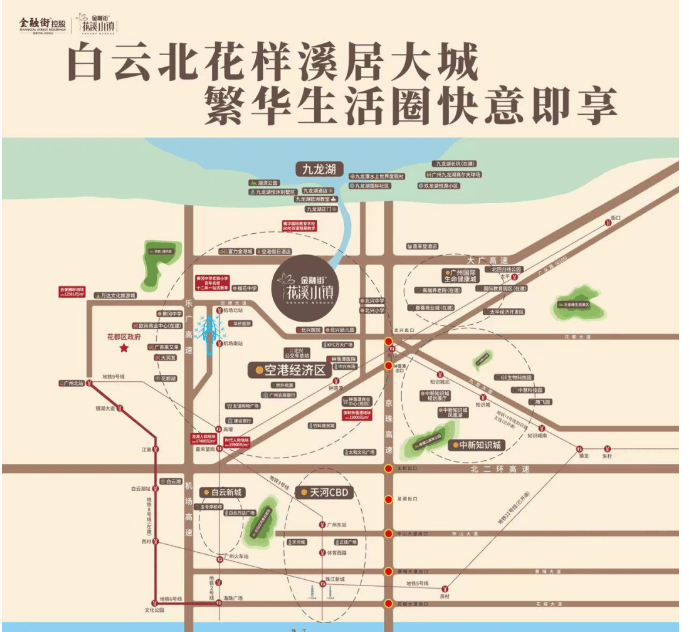 金融街·花溪小镇占地超过10万㎡,总建筑面积达37万㎡,规划超过3000户国际住区。项目通过京港澳高速接驳华南快速,畅达珠江新城。周边交通网络发达,包括2条已开通的地铁线以及建设中的城际轨道,30分钟即可直达市中心,1-2小时可通往珠三角地区。项目不仅地理位置优越,还毗邻九龙湖国家4A级景区,享有得天独厚的自然景观资源。