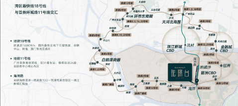 轨道交通方面,项目实打实双地铁入户布局,楼下约90米直达地铁11号线、18号线交汇龙潭站,依托两大高规格地铁线路,实现高效通勤。地铁18号线作为国内领先的全地下市域快线,时速领先,横向串联中山、珠海、澳门等湾区重点城市,拉近城际时空距离;地铁11号线为广州首条环形地铁干线,全线设31座车站,26座换乘站点,无缝接驳全城各大地铁线路,轻松换乘直达天河、越秀、荔湾、番禺等核心片区。依托双轨加持,1站直达琶洲CBD,2站抵达珠江新城,3站快速通达金融城,三大核心商务区无缝衔接,通勤效率大幅提升。