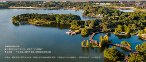 外部核心生态资源为海珠国家湿地公园,作为全国首个入选世界自然保护联盟的国家湿地公园,坐落于广州城市中轴之上,生态价值不可复制。湿地总规模广袤,内部收录202种鸟类、835种维管束植物、903种昆虫,完整的生态系统构筑天然城市绿肺,有效净化空气、调节气温、涵养水土,日常释放高浓度负氧离子,远离城芯喧嚣与空气污染,为业主提供康养、休闲、观景的天然后花园。项目规划专属地铁连廊,业主可通过无风雨通道步行直达湿地,茶余饭后漫步林间跑道、观景栈道,沉浸式感受自然意趣,实现繁华与自然的自由切换。