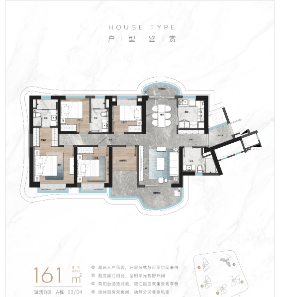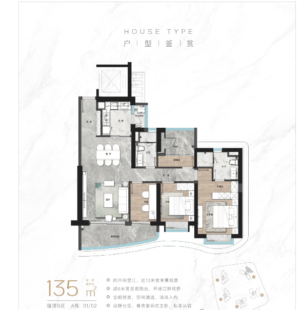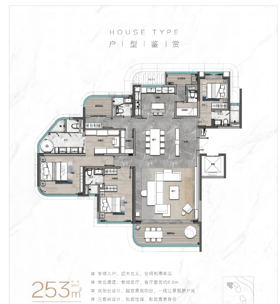 目前在售户型面积涵盖109-253平方米的滨江现房以及105-275平方米的临江大平层公馆。所有户型均采用德国百年高端品牌的装修标准,即使是较小的户型也配置了大金空调、德国美诺厨电等高端设备。特别是较大户型,更是升级为嘉格纳七件套厨电,提供了顶级的生活品质。
