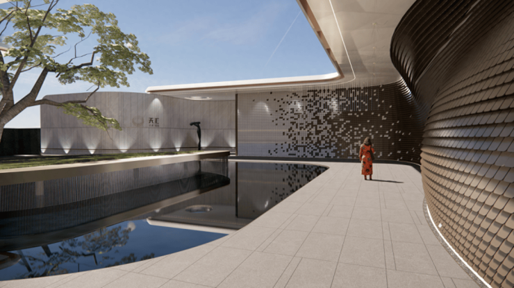 小区的空间布局遵循“一纵一环九节点”,整体为现代化简约风格,结合周边珍贵自然资源,设计理念融合山色与流水概念,创造以“流动 的森林”为主题的园林。