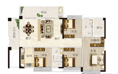 建面约137㎡D户型:四房两卫,超大入户花园可打造私人庭院,主卧配备尊奢衣帽间,三分离卫浴设计,尽显大家风范。