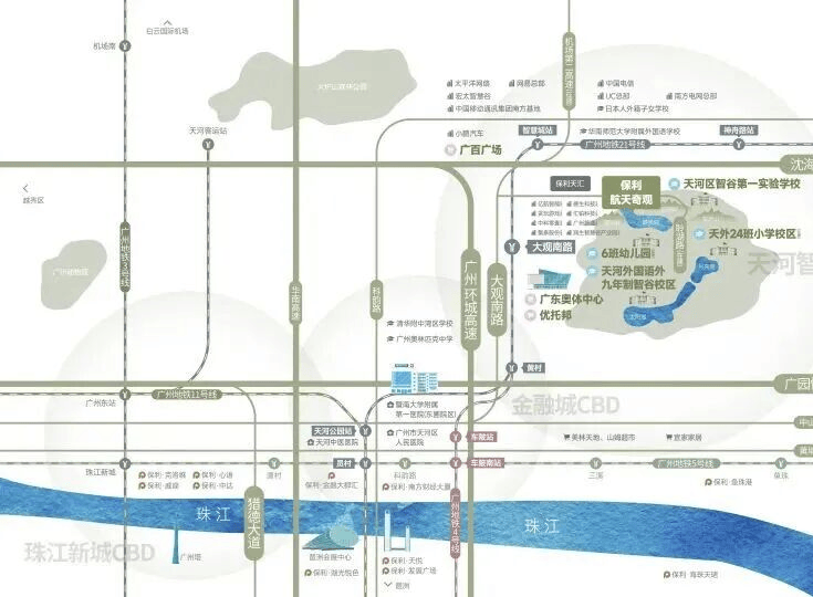 地铁:距离21号线大观南站直线距离约1.2公里(数据来源:百度地图测距),串联天河CBD以及黄埔、增城