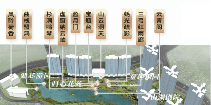 结合映辰湖景观资源,创造“四园十景”,实现“居所-园林-湖泊”之间的无边界融合。而“余荫山房”造园精髓以及“书香文雅”的书院规制,打造以水居中,环水建园的新中式岭南风园林。