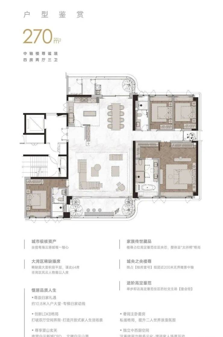 264㎡顶复户型配备60㎡专属露台,可360°俯瞰白云新城与白云山,全屋套房设计,主卧带独立书房与观景浴缸(来源:项目样板间实测数据)。