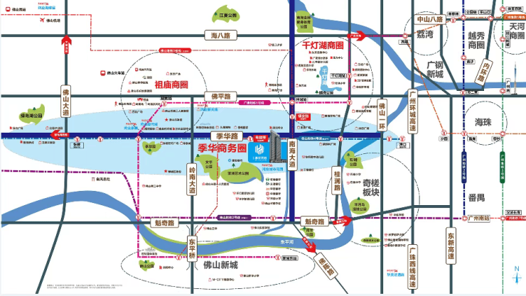 项目所在区域堪称佛山交通最密集板块之一。步行范围内即有地铁2号线“石湾站”及“魁奇路站”,后者更是2号线与广佛线换乘枢纽,30分钟直达广州南站;周边季华路、魁奇路、佛山大道等主干道纵横交错,驾车15分钟内可通达禅城核心区、顺德北部及南海桂城。此外,项目紧邻公交枢纽站,数十条线路覆盖全市主要区域。更值得期待的是,佛山地铁4号线(在建)未来将在附近设站,进一步强化区域通达性。对于依赖公共交通的上班族或投资客而言,这样的交通配置无疑是加分项。