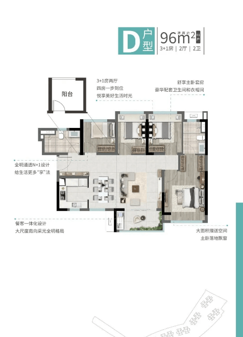 96㎡3+1 房两厅两卫:终极刚需户型,四房布局满足多人口家庭,南北对流,大面积赠送空间可灵活改造,主卧套房带独立卫浴,智能化交标(人脸识别通行)提升居住便捷度,适合计划生育或三代同堂的家庭。