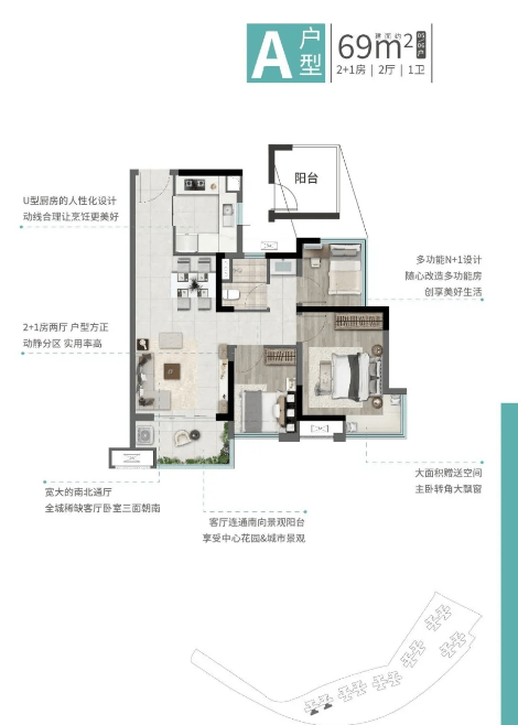 69㎡2+1 房两厅一卫:全城稀缺小面积三房,三面朝南,客厅连通南向景观阳台,主卧带转角飘窗,额外拓展空间可改造成书房或储物间,63 万起的总价,适合年轻刚需首次置业;