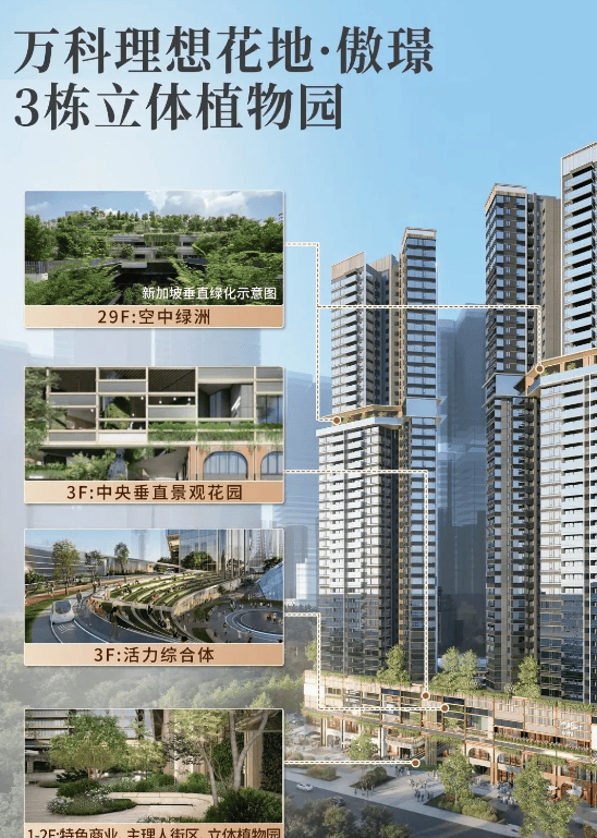万科・理想花地・傲璟由品牌房企万科开发,依托万科强大的造城实力与物业口碑,为项目品质保驾护航。项目总建筑面积约 16 万㎡,共规划 4 栋住宅,总户数约 844 套,梯户比根据楼层分区有所不同:4-28 层为低区(2T6),30-44 层为高区(2T5),低区电梯仅服务 24 层约 150 户,高区电梯仅覆盖 14 层,保障居住私密性与出行效率。项目最大的设计亮点是 “立体植物园社区”,楼栋分布高低错落,1-2 层规划商业街区 + 立体植物园,3 层设体育会所,30 层打造空中会所,功能分区清晰,营造出兼具自然氛围与高端质感的居住环境。