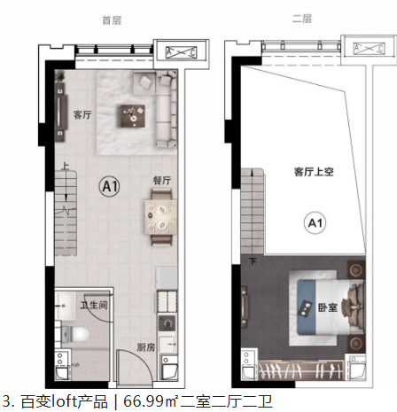 🏠 百变 LOFT(66.99㎡二室二厅二卫):
