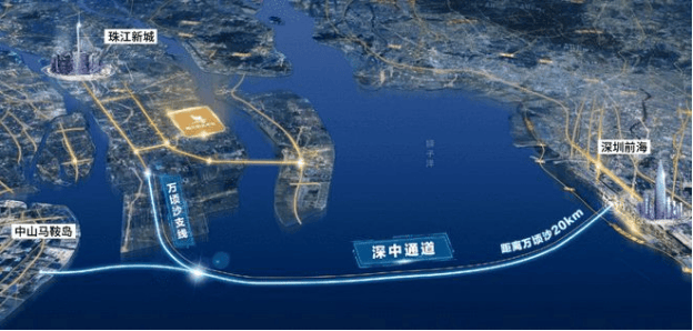 除了22号地铁线通往深圳之外, 规划中的深中通道,计划 2024 年开通,东起于广深沿江高速,与深圳宝安机场互通,西至中山马鞍岛,全长仅约24公里 ,南中高速连接南沙万顷沙支线,接驳凤凰大道,明珠湾大桥等直通主城区,深中通道建成通车后,在万顷沙去前海比在深圳罗湖去前海更快。深中通道是连接珠江东西岸的重要通道,不单止大大缩短了南沙与中山、深圳的距离,与港澳地区的连接也将更密切。