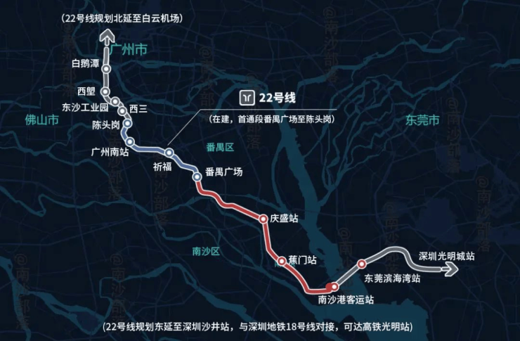 以南沙为中间节点,22号线一头连接广州中心城区,另一头联通东莞,延伸至深圳,让广深实现了首次牵手,改写大湾区现有格局。