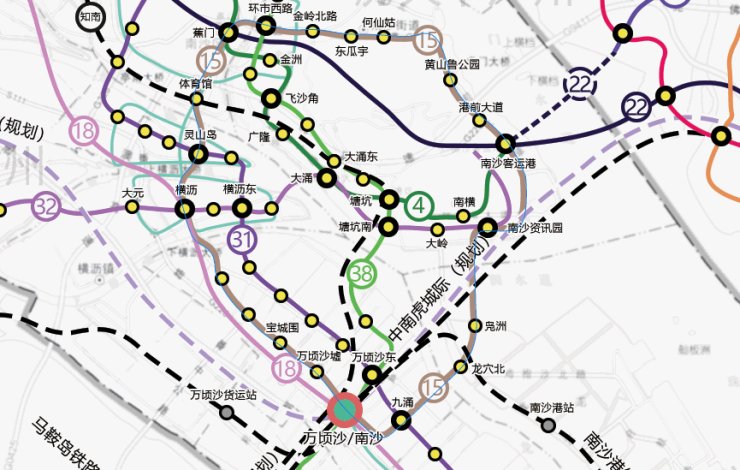 南沙内部依附15号线地铁(规划中),将整个南沙串联起来,涵盖金洲、蕉门、灵山岛、万顷沙,拉近各功能组团距离,实现价值共同发展。在新增的22号线南延段补齐了内环南部短板,从番禺广场出发,经过庆盛、蕉门,到达南沙客运港,三度与地铁4号线实现换乘。将南沙科学城、东莞滨海湾新区和深圳光明区科学城串联,与“广深港澳科技创新走廊”走向一致,有利于推动实现人才流通和产业协作互补。