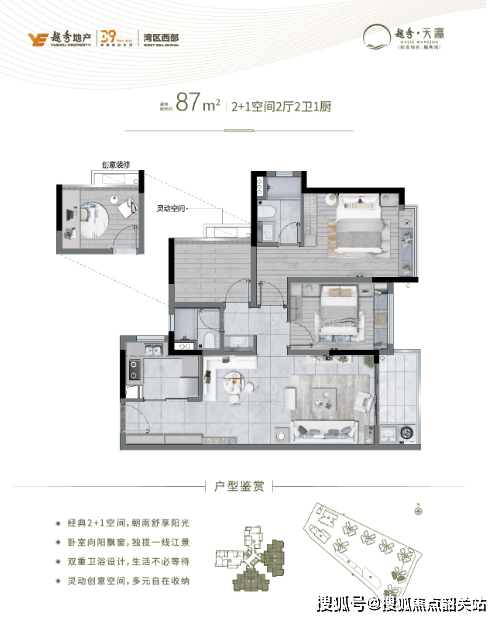 户型数据:主推87㎡、104㎡、125㎡“N+1”创意空间,实测使用率达94%-98%(远超市场常规85%),以87㎡户型为例: