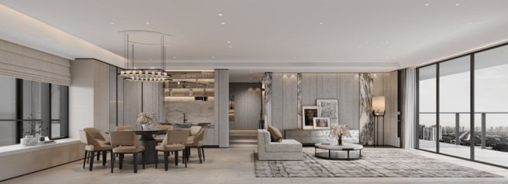 而作为项目的顶级户型,330㎡天幕大平层更是将顶豪居住体验推向极致。五开间朝南的奢阔设计,让整个户型采光面达到最大化,阳光铺满全屋,温暖而明亮。客厅采用约19.2M超长“LDKB”一体化设计,将客厅、餐厅、厨房、阳台完美融合,打造出超尺度的家庭社交核心。搭配超大L型景观阳台,形成270°环江巨幕景观视野,坐在客厅中,珠江的壮阔江景、城市的璀璨灯火、琶洲的繁华天际线一览无余,每一眼都是震撼人心的视觉盛宴,每一刻都是极致奢阔的生活享受。