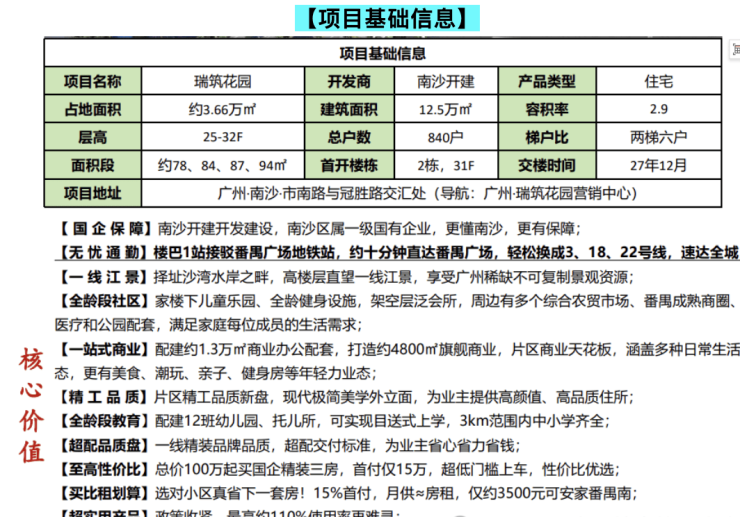瑞筑花园产品定位兼顾首置购房者与改善型家庭,户型灵活多样,实用率高,居住舒适度强。项目交通便利,可快速连接番禺广场及广州南沙各区,地铁、公交及高速道路网络完善,为日常通勤及生活出行提供保障。社区自建幼儿园及托儿所,并规划九年一贯制学校,教育配套齐全,满足家庭全龄段需求。自建商业街铺及周边成熟商圈,使居民生活便利,无需远行即可满足购物、餐饮、娱乐及健身需求。医疗资源充分,靠近多家三甲医院,为家庭健康提供保障。购房者可通过首付分期及合理贷款规划,实现月供可控。综合交通、教育、商业及医疗配套,瑞筑花园适合年轻家庭轻松置业,同时兼顾投资潜力及居住价值,为首次置业或改善型家庭提供高品质、便利、舒适的生活选择。