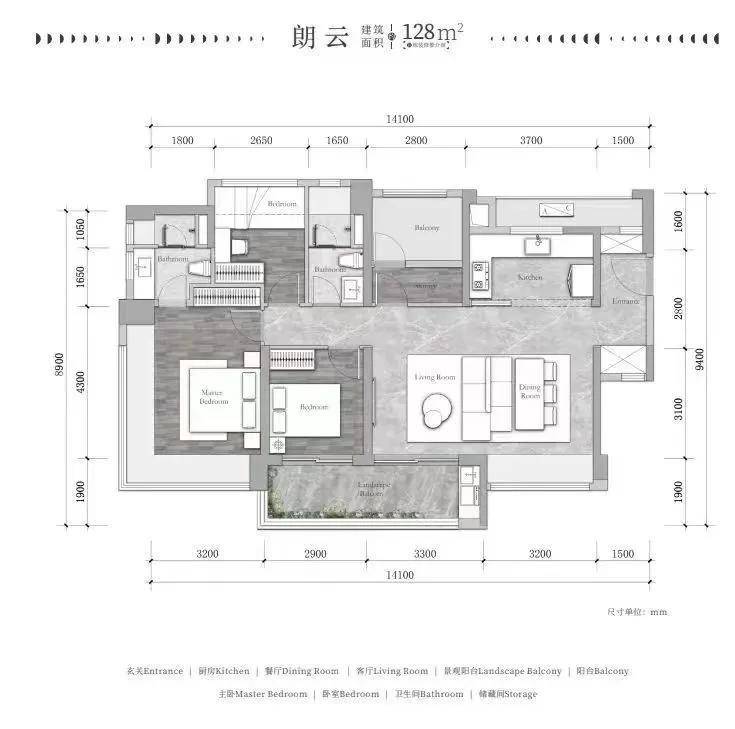 128㎡四房两卫户型:大户型设计,空间宽敞舒适,适合改善型家庭居住;主卧套房设计,配备独立卫生间、衣帽间和观景飘窗,提升了居住的舒适度和私密性;客厅采用横厅设计,视野开阔,连接超大阳台,采光通风效果一流;次卧空间充足,可根据需求改造成书房、儿童房等,灵活性高。