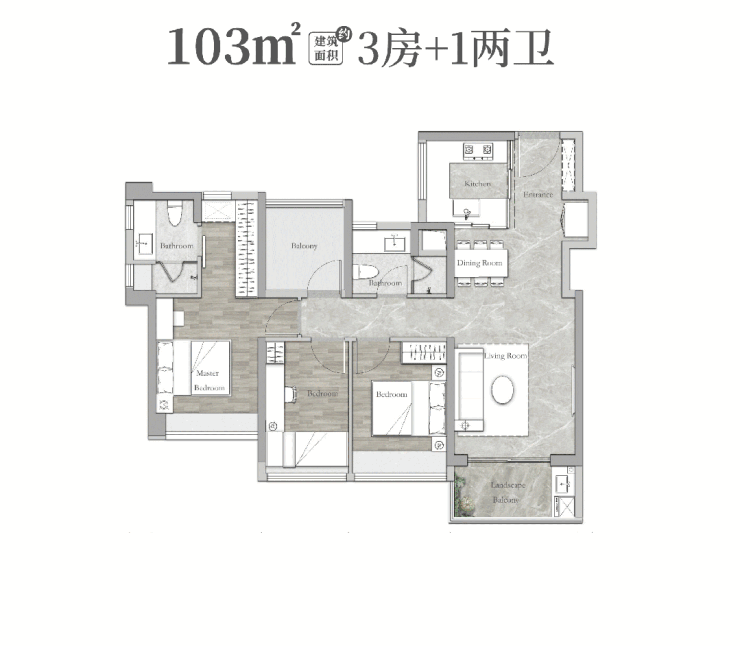 103㎡三房两卫户型:该户型布局方正,南北通透,采光通风效果极佳;客厅连接观景阳台,拓展了室内空间,同时让业主能够欣赏到社区园林美景;主卧配备独立卫生间和衣帽间,保障了业主的私密性和舒适度;厨房采用U型设计,操作空间充足,方便日常烹饪。