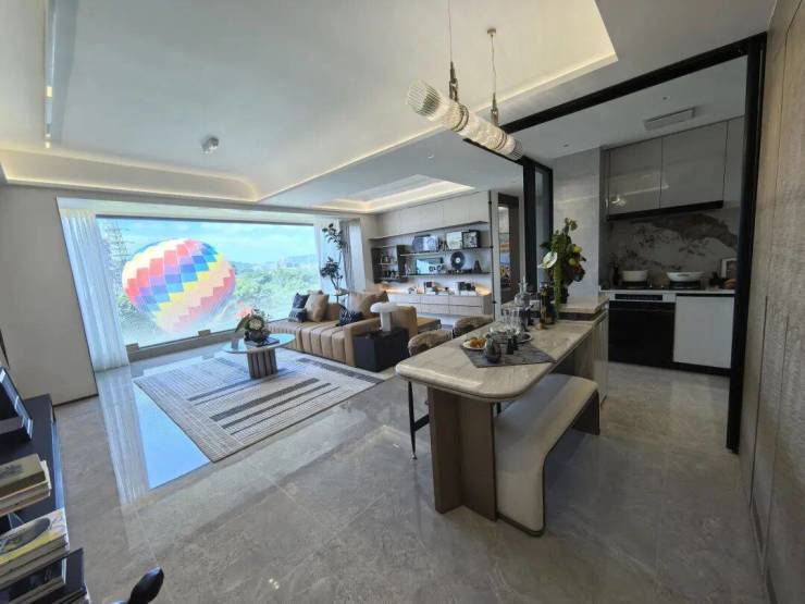 其中的B1户型也是LDKG一体+四开间朝南的布局,阳台宽度达到约5.6米宽,样板间同样打通了次卧。