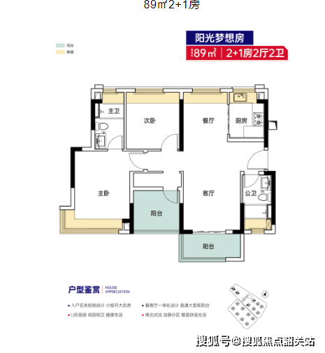 89㎡2+1房,改善刚需兼顾户型,该户型为2+1房设计,超九成使用率,空间开阔、格局合理,兼顾刚需与改善需求。户型南北通透、采光通风极佳,客厅宽敞明亮,连接超大阳台,可俯瞰社区绿化景观,享受舒适的居住体验;卧室空间充足,主卧配备独立卫生间与飘窗,提升私密性与居住舒适度,次卧与灵动空间可根据家庭需求改造,适配三口之家、四口之家居住,既满足日常居住需求,又能预留充足的活动空间,性价比极高。