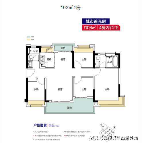 103㎡4房,改善型优选户型,该户型为4房设计,超九成使用率,空间开阔、格局方正,适合改善型家庭或四口之家、五口之家居住。户型南北通透,采光通风极佳,客厅、餐厅分区明确,活动空间开阔,方便亲友聚会与日常起居;四个卧室布局合理,私密性强,主卧配备独立卫生间与飘窗,居住舒适度高,其余卧室空间充足,可满足家人居住、孩子学习、老人静养等多种需求;同时,户型还配备储物空间,方便业主存放生活用品,兼顾实用性与舒适性,是改善型置业的优选户型。