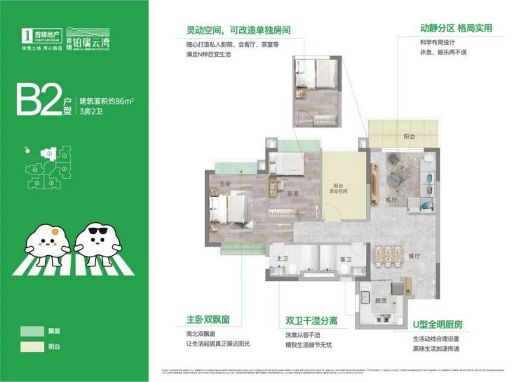 86㎡3 房 2 厅 2 卫:U 型全明厨房,双明卫,主卧双飘窗。