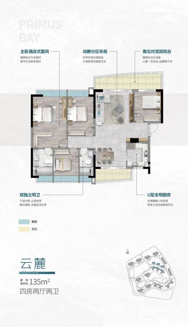 135㎡四房两厅两卫:双阳台南北对流,LDK 一体化设计,U 型全明厨房。