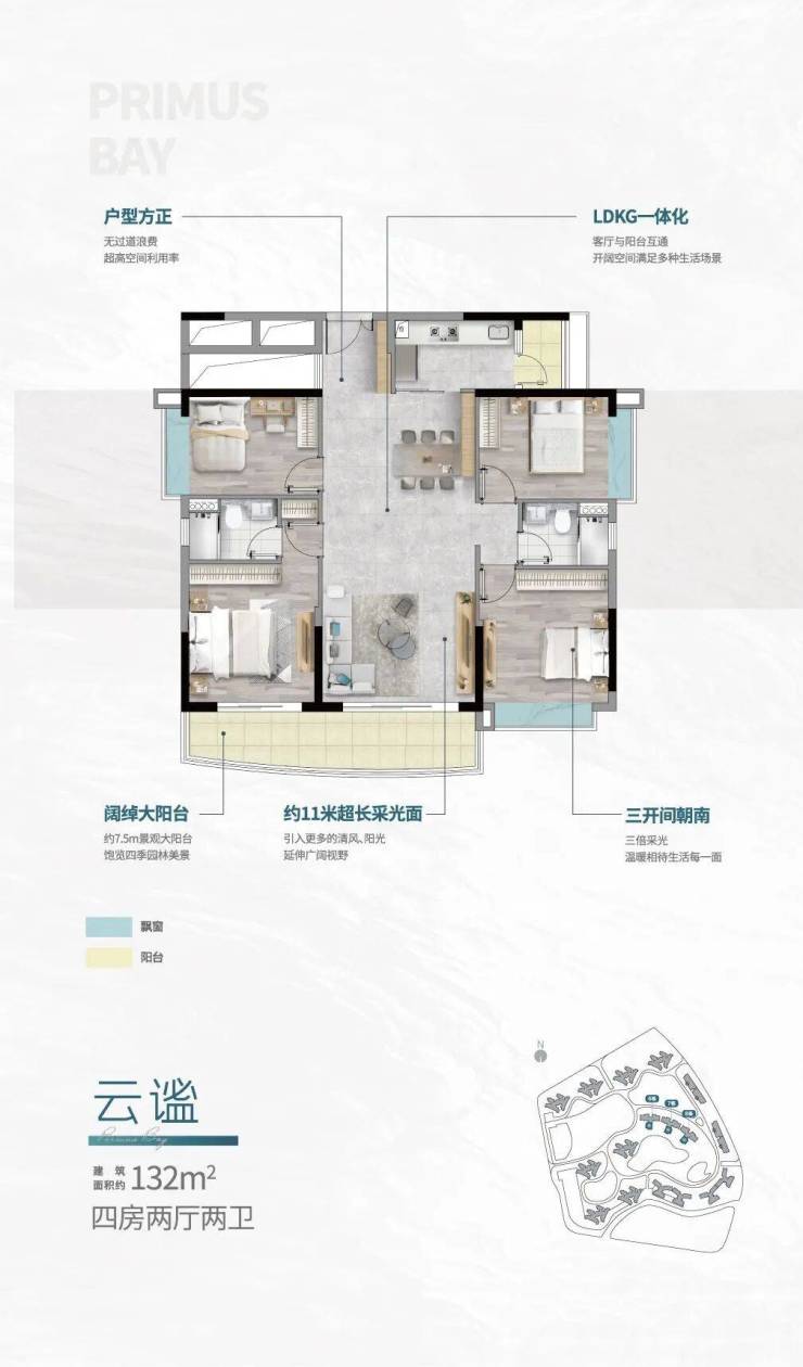132㎡四房两厅两卫:一体式双厅布局,双阳台设计,约 12.6m 超长采光面,房间设阔景飘窗。