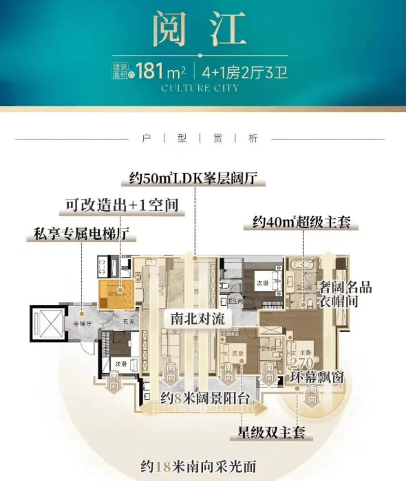 而建面约181㎡的大平层,则堪称“终极改善”的范本。约18米的南向IMAX湖景风光,全屋南北对流,穿堂风自由畅通。近16㎡的南向全景阳台,拥有约8米的巨幕观景面,是品茗、赏景、聚会的绝佳场所。专属独立电梯厅、约4㎡的入户鞋帽间形成的“内外双玄关”设计,更是将归家的仪式感拉满。