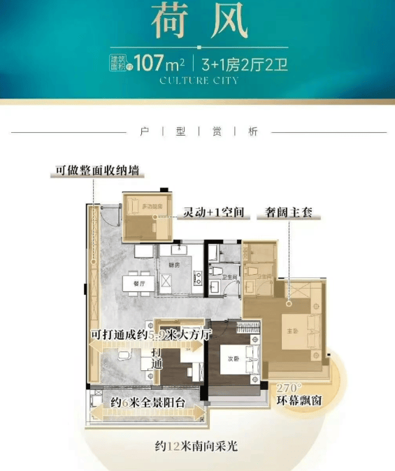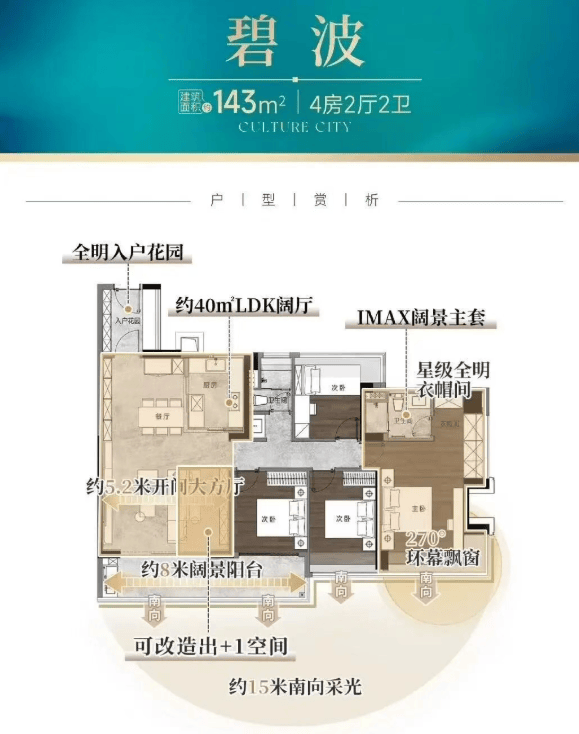 具体来看,建面约107㎡的四房,拥有惊人的12米南向采光面,LDK一体化设计搭配约6米奢阔阳台,还带有独立入户花园,功能性极强。建面约128㎡的四房,南向采光面延伸至约16米,南北对流,约40㎡的LDK阔厅足以碾压市场同面积产品。建面约142㎡的四房,同样拥有约16米南向采光,站在约8米全景阳台上,约1.2万㎡的湖景扑面而来,高层单位更可远眺江景。
